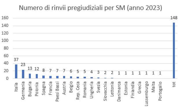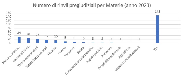 Di seguito si pubblicano le rappresentazioni grafiche dei rinvii pregiudiziali classificati sia per materia e/o macroarea che per Stato della giurisdizione di rinvio.