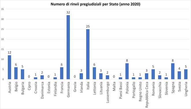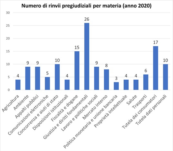 Di seguito si pubblicano le rappresentazioni grafiche dei rinvii pregiudiziali classificati sia per materia e/o macroarea che per Stato della giurisdizione di rinvio.