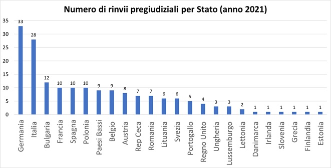Di seguito si pubblicano le rappresentazioni grafiche dei rinvii pregiudiziali classificati sia per materia e/o macroarea che per Stato della giurisdizione di rinvio.