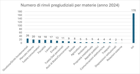Di seguito si pubblicano le rappresentazioni grafiche dei rinvii pregiudiziali classificati sia per materia e/o macroarea che per Stato della giurisdizione di rinvio.