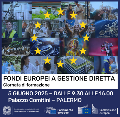 Il Dipartimento per gli Affari Europei ha organizzato giovedì 5 giugno 2025 a Palermo (Palazzo Comitini, Sala Martorana) il seminario formativo "Fondi europei a gestione diretta" con l'obiettivo di promuovere una maggiore conoscenza e diffusione dei programmi europei a gestione diretta.