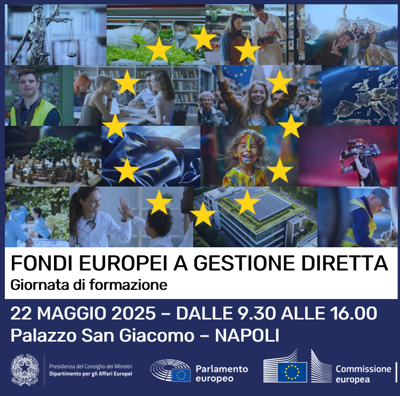 Il Dipartimento per gli Affari Europei ha organizzato giovedì 22 maggio 2025 a Napoli (Palazzo San Giacomo, Sala della Giunta) il seminario formativo "Fondi europei a gestione diretta" con l'obiettivo di promuovere una maggiore conoscenza e diffusione dei programmi europei a gestione diretta.