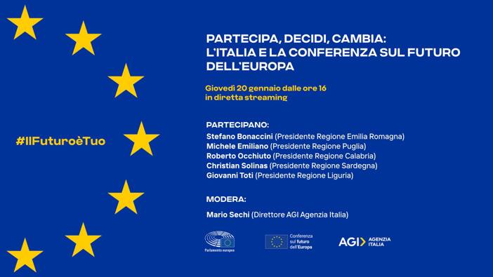 "Partecipa, decidi, cambia. L'Italia e la conferenza sul futuro dell'Europa": un momento di confronto e dibattito promosso dall'agenzia giornalistica AGI sul contributo effettivo che le Regioni italiane saranno in grado di apportare alla Conferenza e, più in generale, sulle opportunità che potranno derivare per l'Italia dal suo svolgimento.