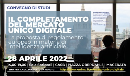 Il Centro di Documentazione Europea (CDE) dell'Università di Macerata organizza un evento su "Il completamento del mercato unico digitale. La proposta di regolamento europeo in materia di intelligenza artificiale" che si svolge giovedì 28 aprile 2022, dalle ore 14:00 alle 19:00.