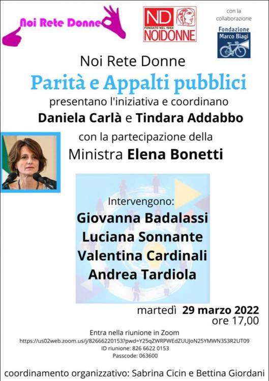 Noi Rete Donne e NOIDONNE con la collaborazione della Fondazione Marco Biagi organizza martedì 29 marzo 2022 alle ore 15,30 l'incontro on line "Parità e Appalti pubblici" con la partecipazione della Ministra Elena Bonetti.