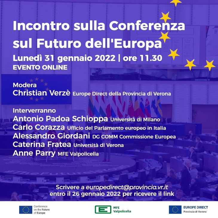 Lo Europe Direct della Provincia di Verona, in collaborazione con il Movimento Federalista Europeo (MFE) della Valpolicella, organizza un incontro online aperto a tutta la cittadinanza, sulla Conferenza sul Futuro dell'Europa – COFE